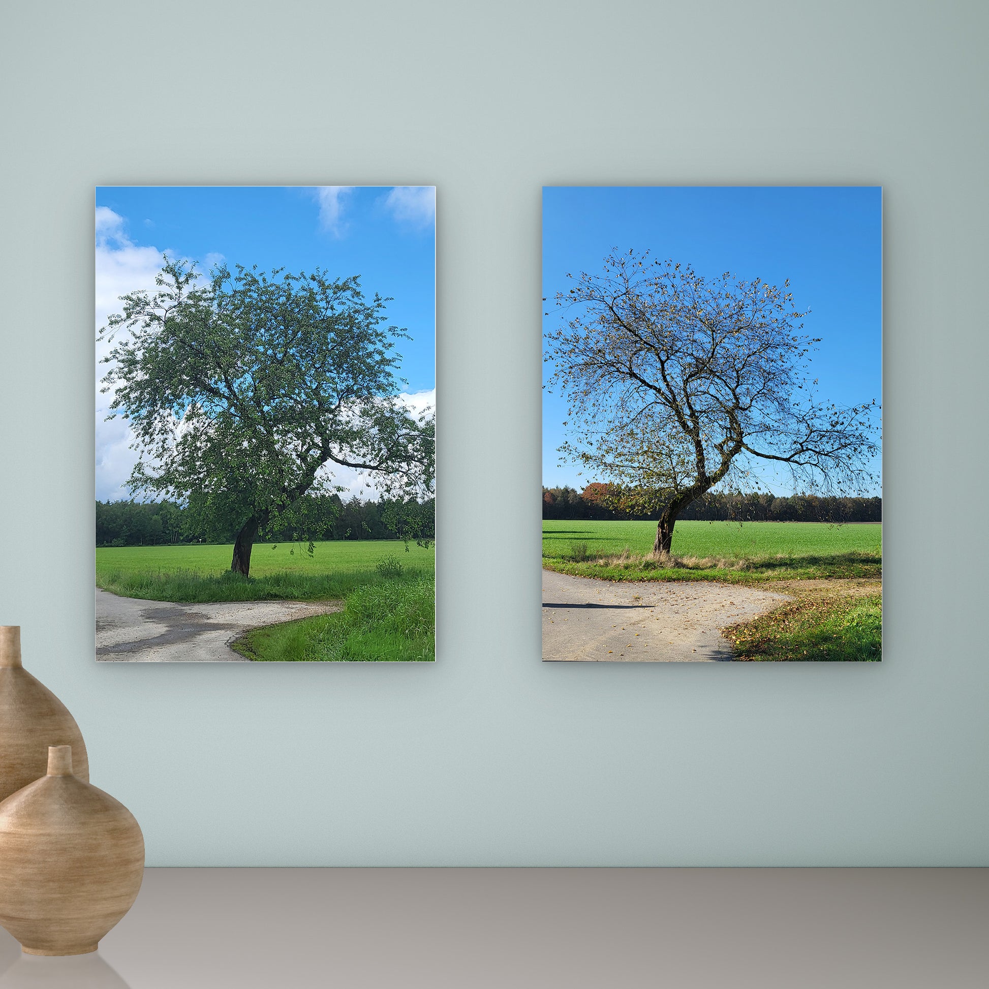 Set van twee aluminium panelen (36,4 × 51,5 cm) met natuurfoto’s van dezelfde boom, vastgelegd in twee seizoenen. Groen blad en vallende bladeren tonen de overgang van groei naar rust.