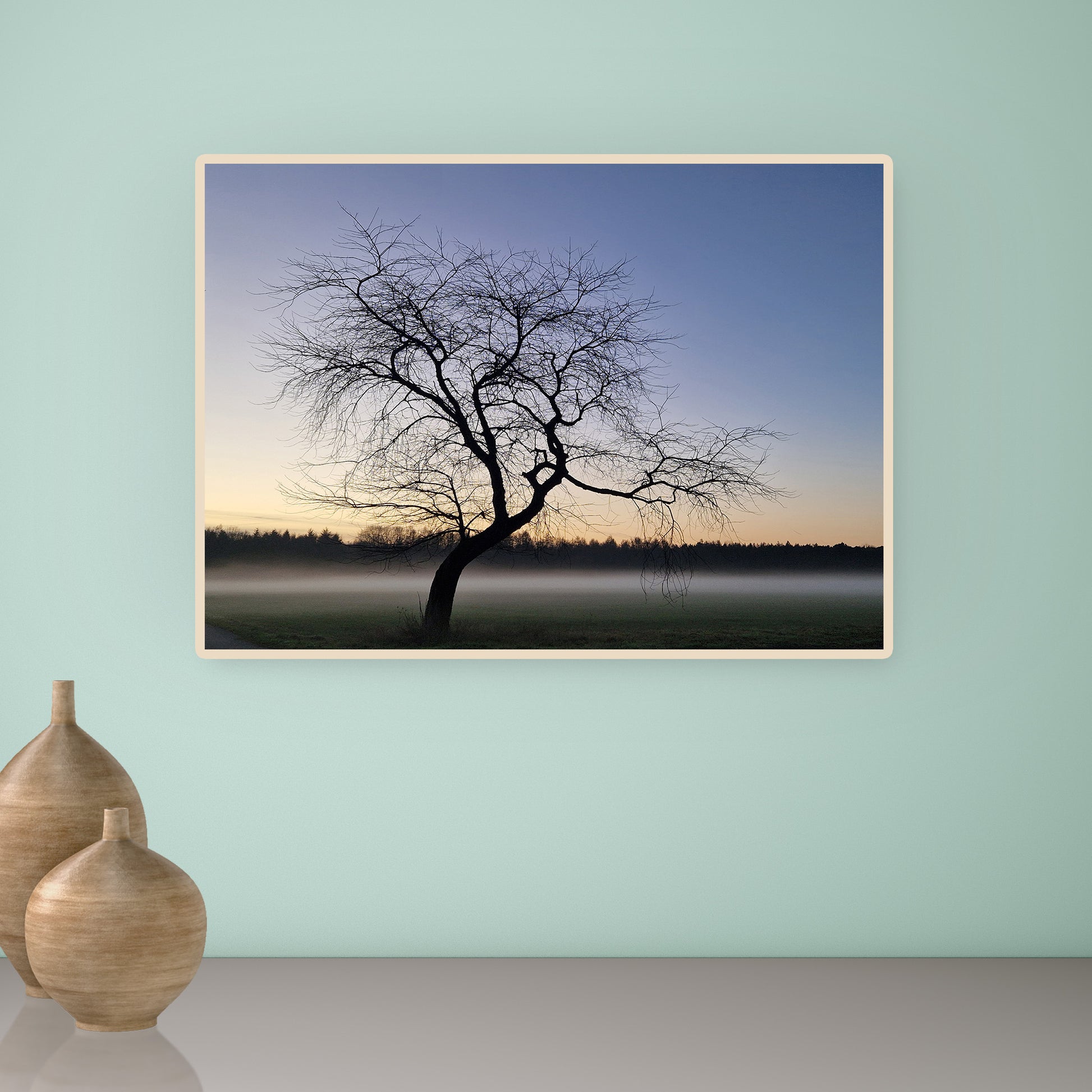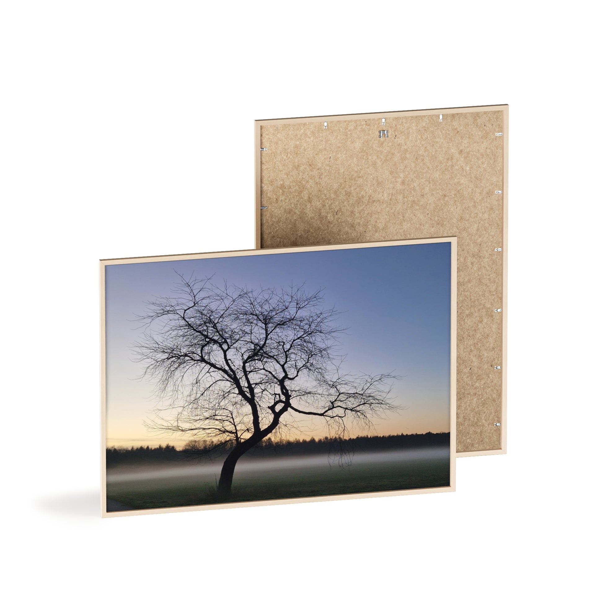 Natuurfoto van een boom in de mist in een naturel houten lijst. Formaat 70 x 50 cm. Gefotografeerd in Oudsbergen (BE)