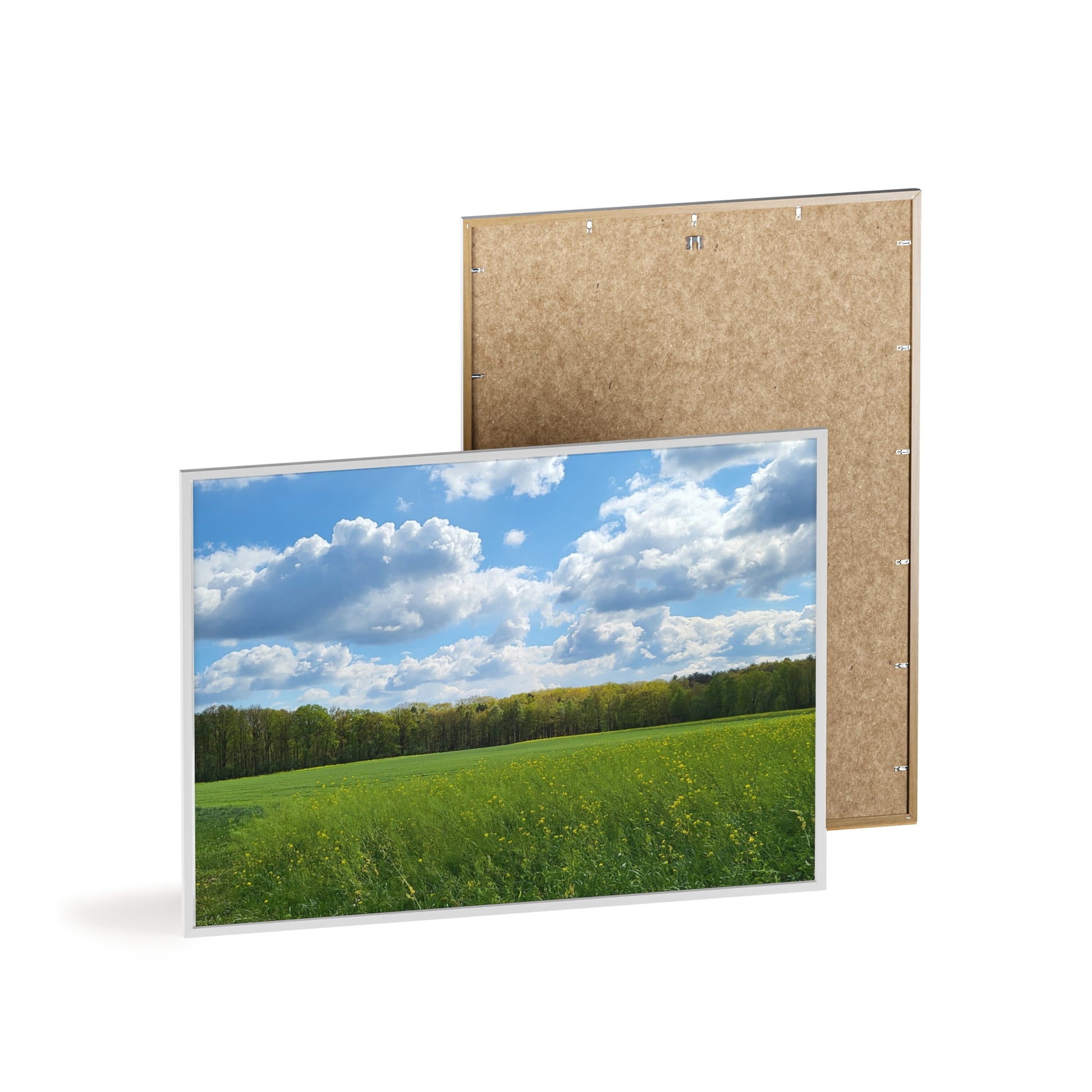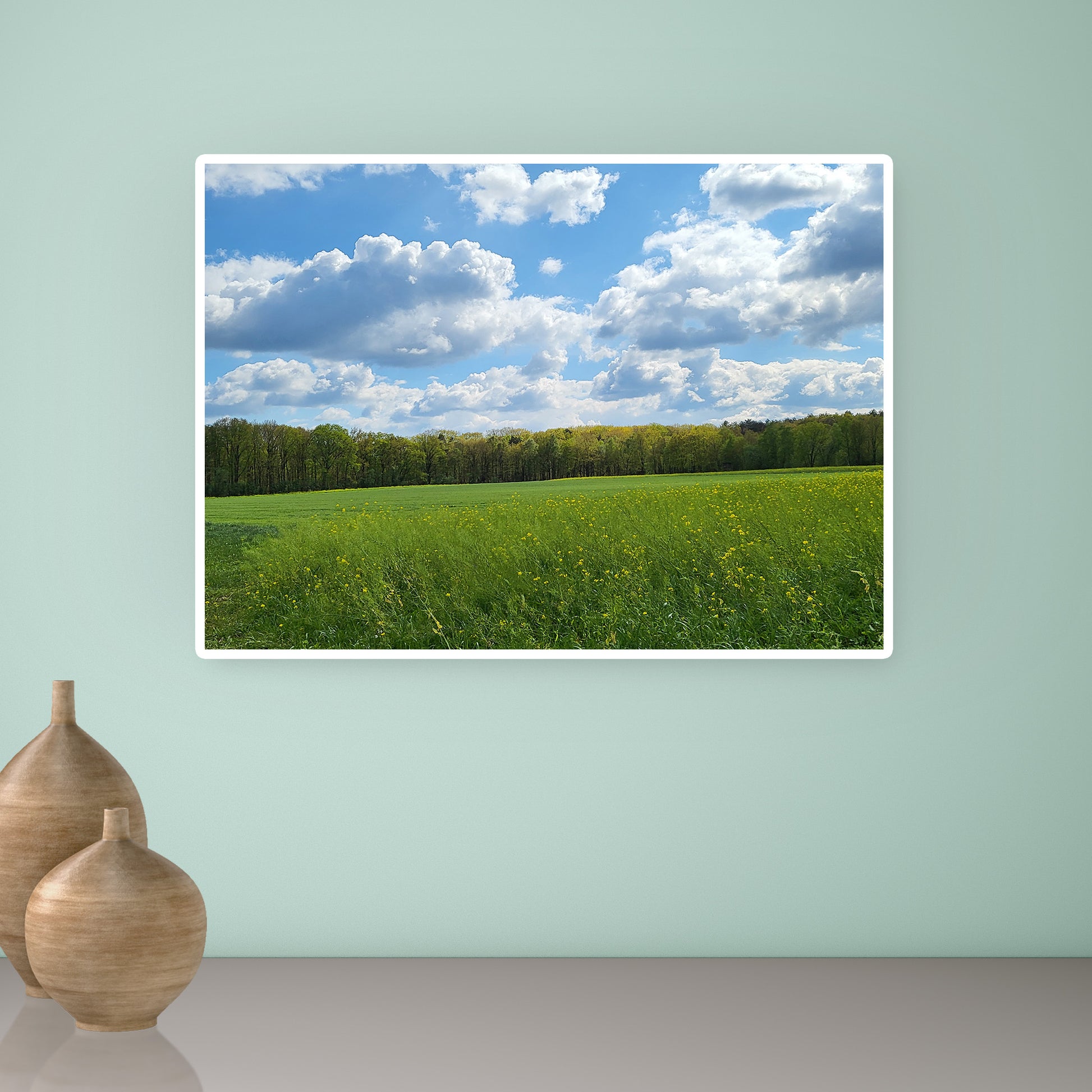 Natuurfoto van een frisgroen landschap in een witte houten lijst. Formaat 70 x 50 cm. Gefotografeerd in Oudsbergen (BE)