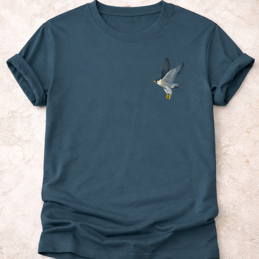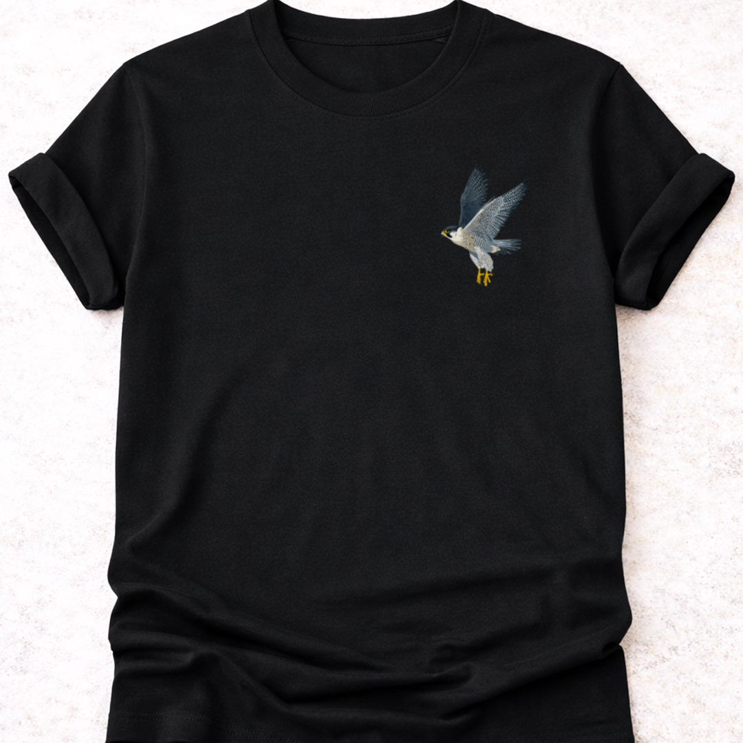 Een premium T-shirt van 100% biologisch katoen met een borstprint van een slechtvalk. Comfortabel, zacht en gemaakt om vaak te dragen.