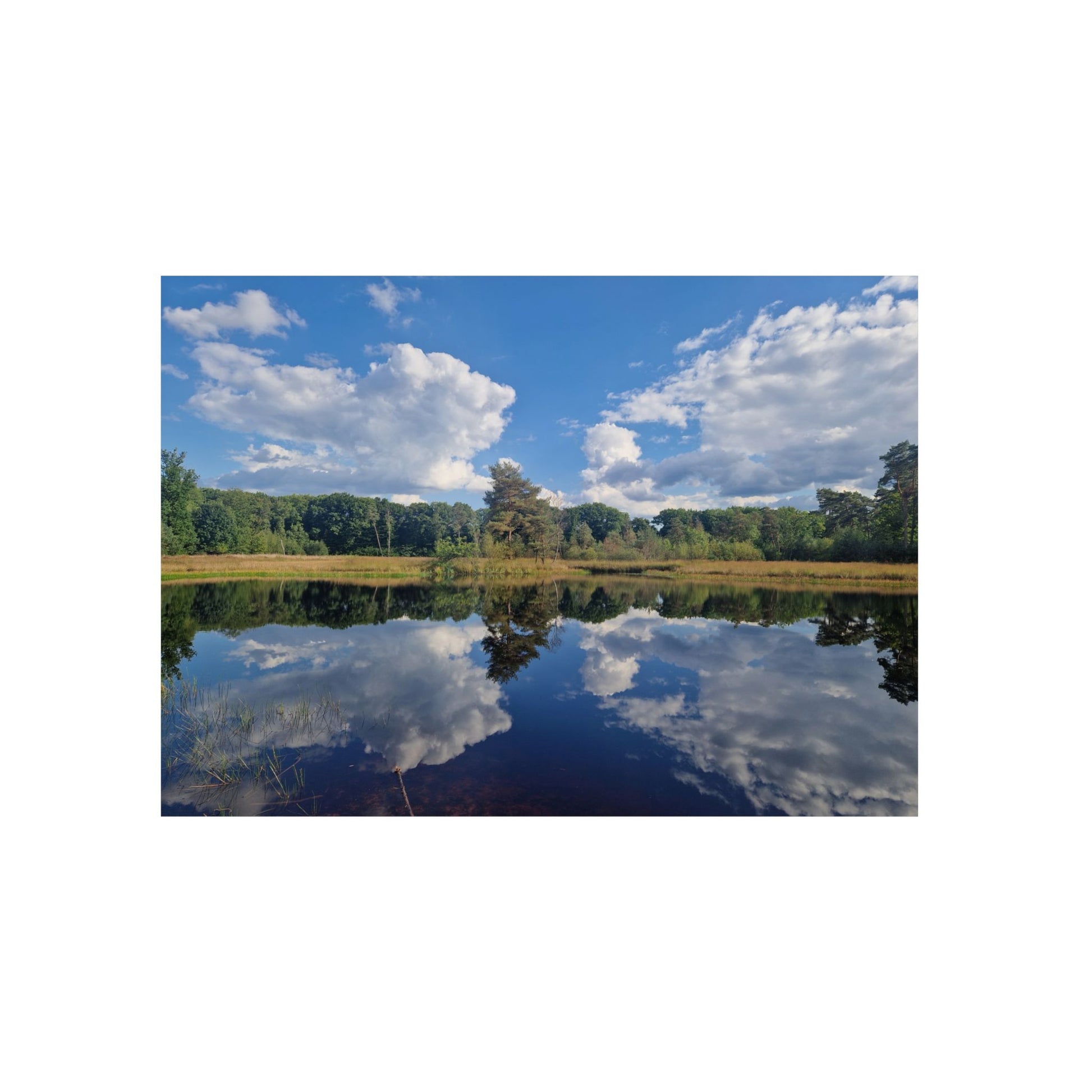 Natuurfoto waarin lucht, bomen en water samenkomen in een bijna perfect spiegelvlak. Afgedrukt op een aluminiumpaneel van 70 × 50 cm. Gefotografeerd in Oudsbergen (BE).